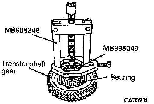 43. Install Bearing Puller MD998348 and Button MB995049 or equivalents on transfer shaft gear bearing to remove bearing.