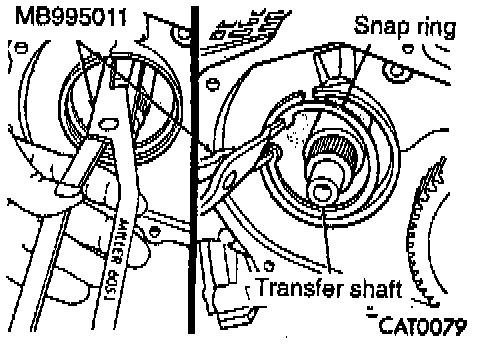 45. Remove transfer shaft bearing snap ring with Snap Ring Pliers MB995008 or equivalent.