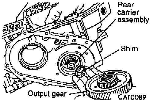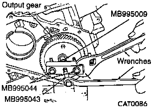 51. Install Gear Puller MB995043 with Bolts MB995044 and Thrust Button MB995009 or equivalents to output gear. Turn puller center bolt clockwise to remove gear.