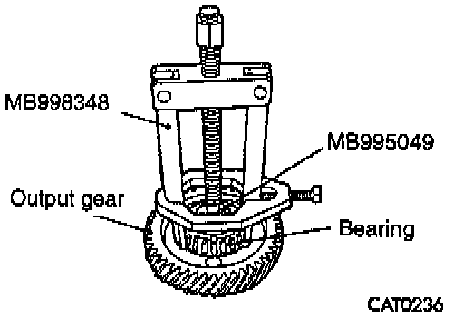 53. Install Bearing and Gear Puller MD998348 and Button MB995049 or equivalents on output gear bearing to remove bearing.