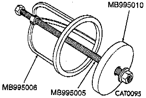 56. Use center bolt of Spring Compressor MB995005, Spring Compressor MB995006 and Disc MB995010 or equivalents to assemble low/reverse spring compressor tool.