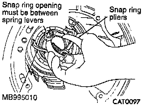 57. Install compressor tool to transaxle as shown. Compress low/reverse piston assembly. Position Spring Compressor MB995005 or equivalent to allow access to snap ring.