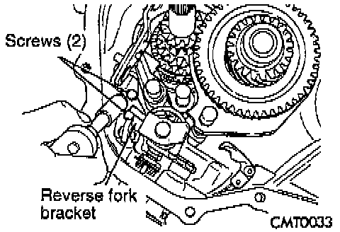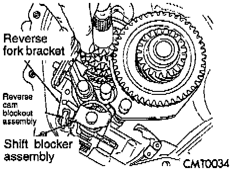 Remove reverse fork bracket and reverse cam blackout assembly.