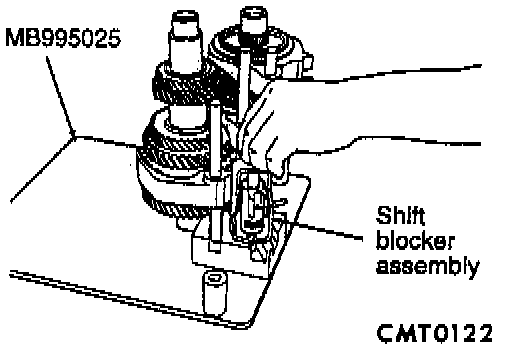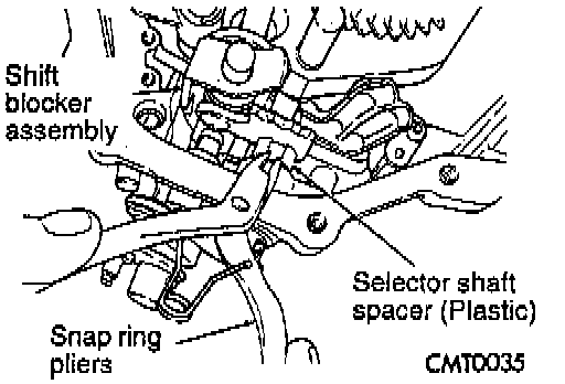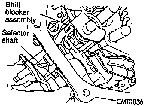 10. Pull the selector shaft shift pin out of the slot in the blocker assembly. Turn selector shaft up and out of the way.