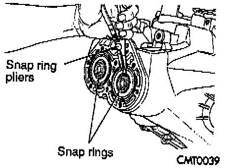 12. Remove two snap rings retaining the output shaft and the input shaft to the bearing.