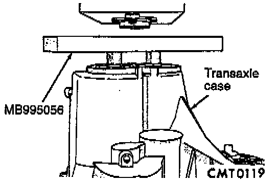 14. Install bearing fixture (MB995056 or equivalent) onto transaxle end bearings. Verify tool is properly aligned to input and output shaft.