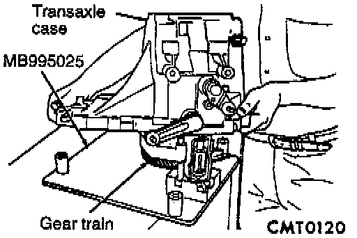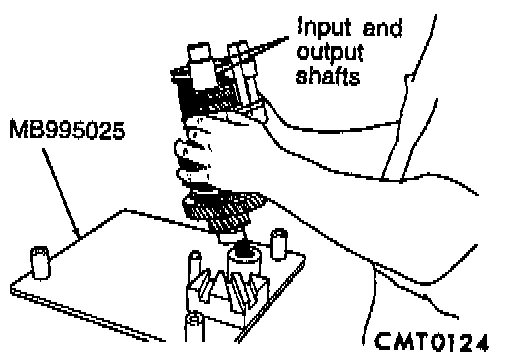 13. Using bench fixture and shims provided (MB995023, MB995024, MB995025 or equivalents), turn transaxle over. Install transaxle onto bench fixture. Verify shim spacers are in position on bench fixture. Install transaxle into shop press.