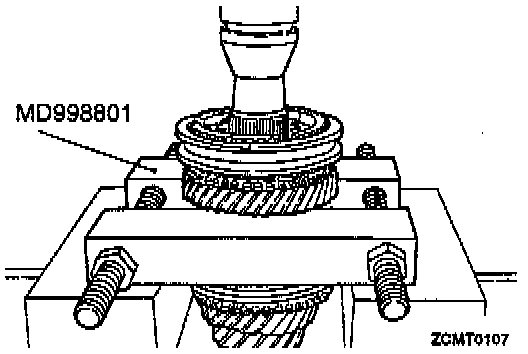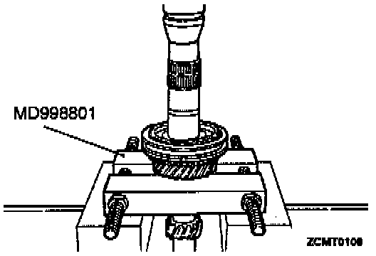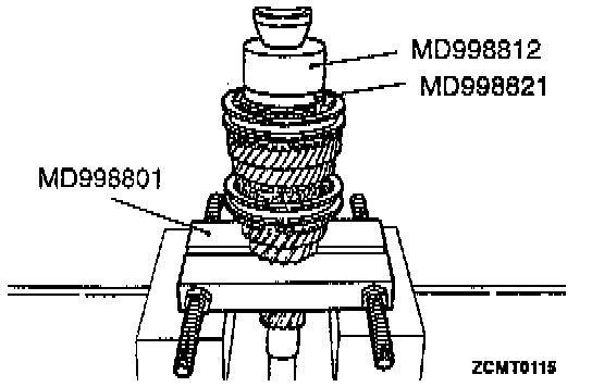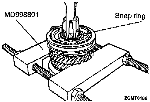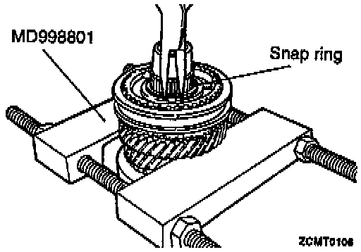 1. Install MD998801 or equivalent behind 5th speed gear. Remove snap ring at 5th synchronizer hub on input shaft.