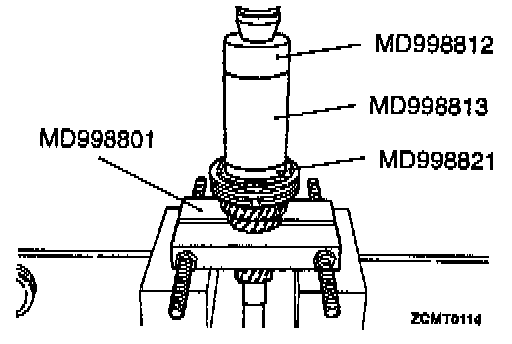 3. Install 3rd gear and 3/4 synchronizer onto input shaft. Install MD998812, MD998813, MD998821 or equivalents over input shaft and press on synchronizer hub and 3rd gear. The synchronizer hub has the letter "U" stamped on the top face of the hub.