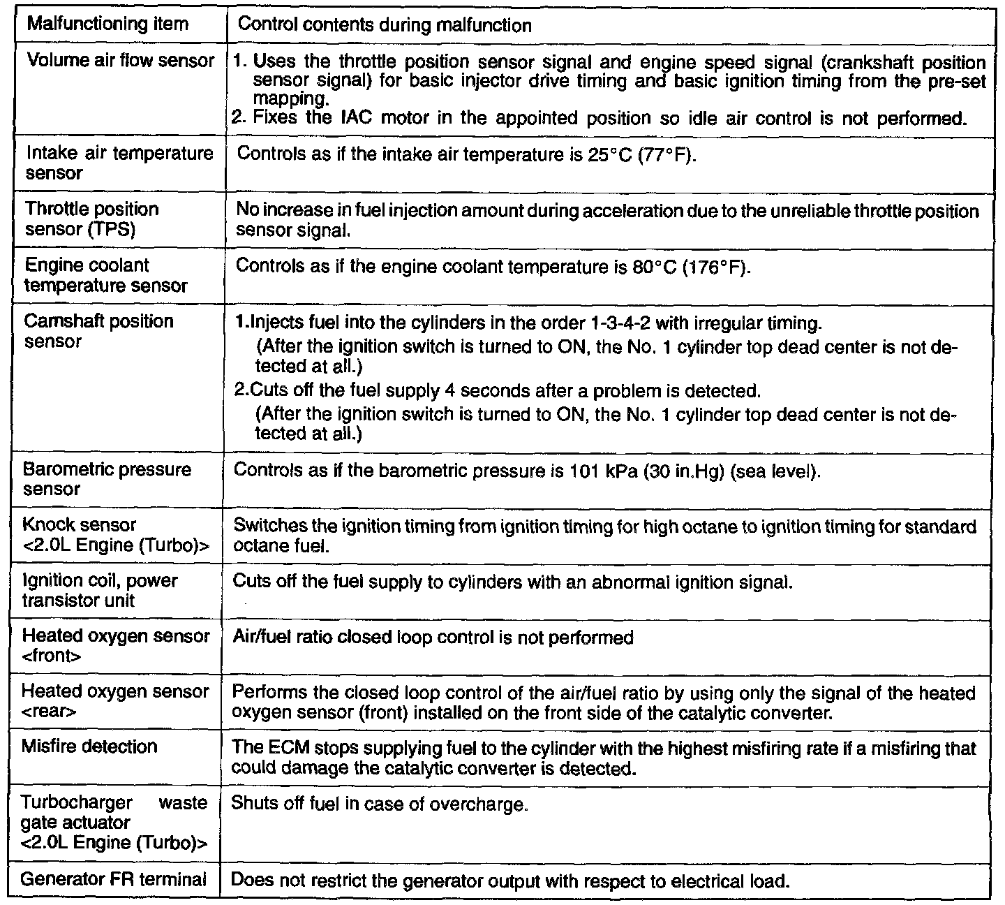 When the main sensor malfunctions are detected by the diagnostic test mode, the vehicle is controlled by means of the following defaults.
