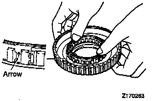 Push the one-way clutch into the outer race. Make sure that arrow on the outside circumference of cage is directed upward-as shown in the illustration when the one-way clutch is pushed in.