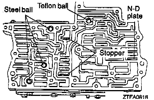 1. Install the stopper plates, N-D plate, Teflon ball, and steel balls into the upper valve; body as shown.