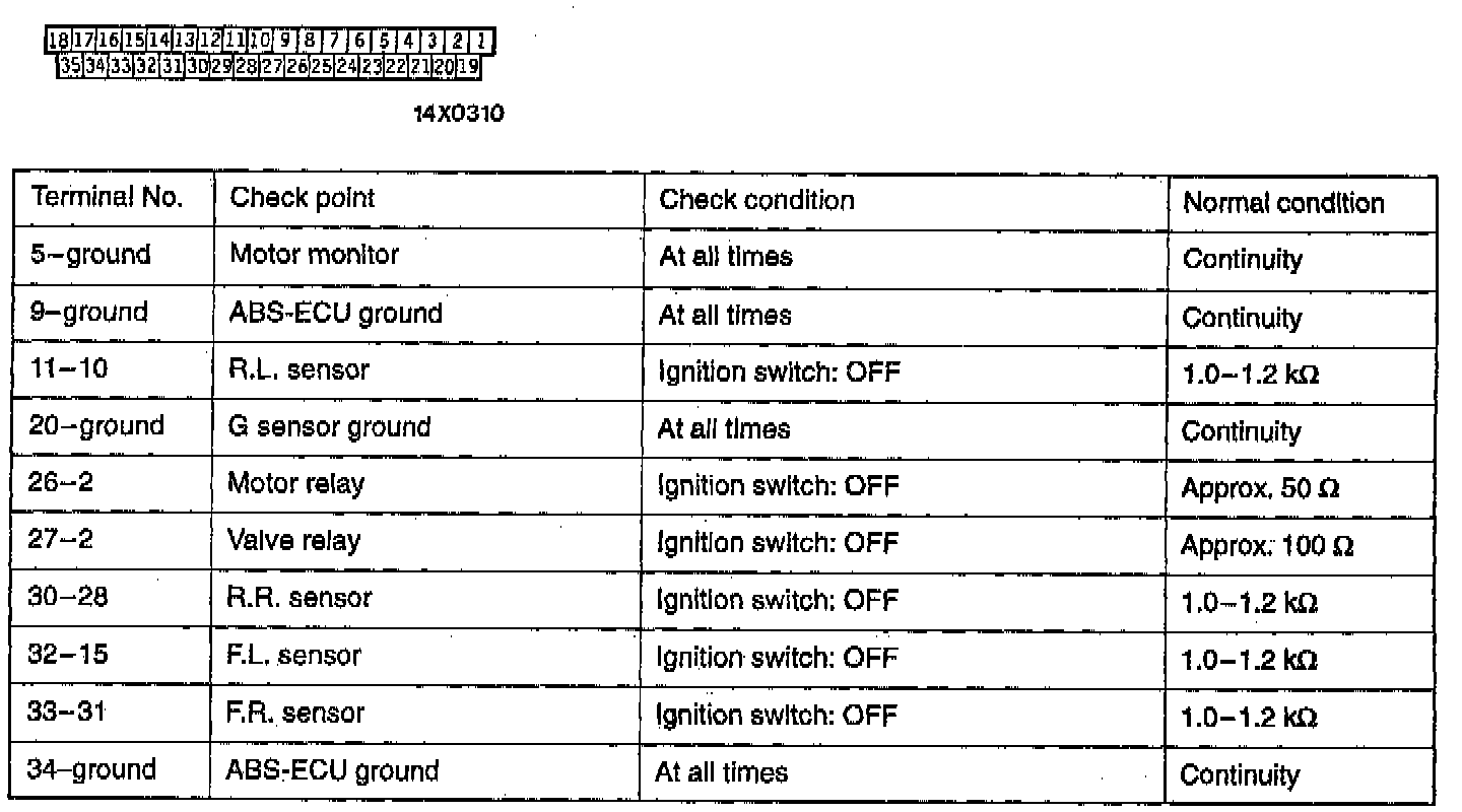 ABS-ECU Terminal Resistance and Continuity CheckCAUTION: If resistance or continuity checks are performed on the wrong terminals, damage to the vehicle wiring, sensors, ABS-ECU, and/or ohmmeter may occur. Use care to prevent this.