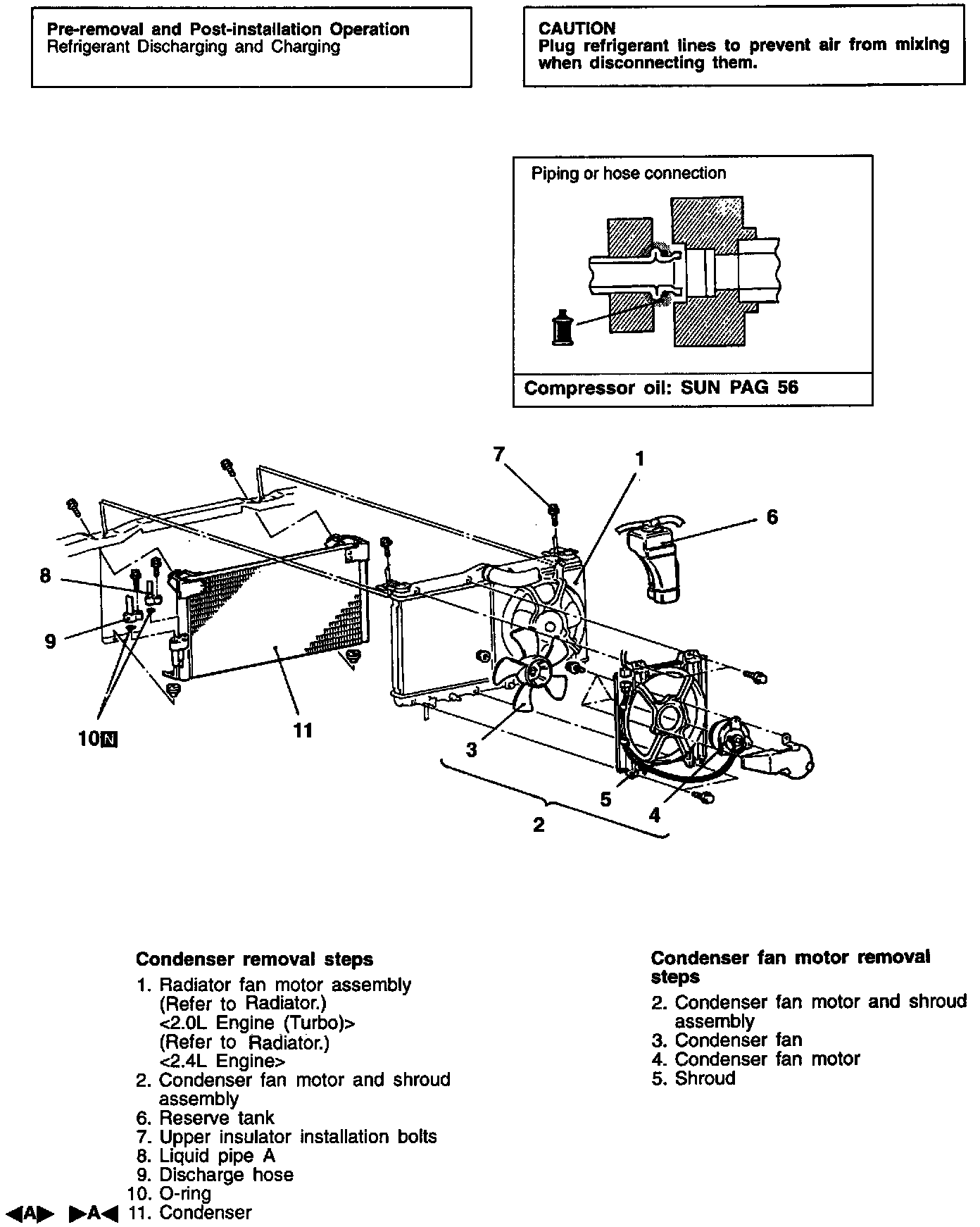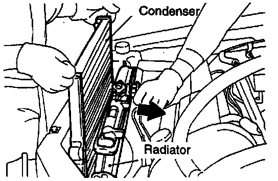 Move the radiator to the engine side and then lift up the condenser to remove it.
