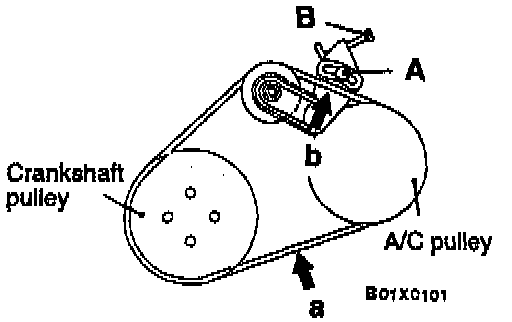 1. Pull or push at the point (a) or (b) with a force of 98 N (22 lbs.) to measure drive belt deflection. The standard value is approximately 6.5 - 7.5 mm (0.26 - 0.30 inch)
