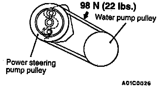 1. Pull or push at the mid point of the belt with a force of 98 N (22 lbs.) to measure drive belt deflection. The standard value is 5.5 - 8.0 mm (0.22 - 0.32 inch).