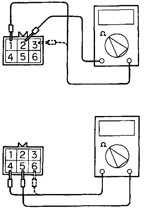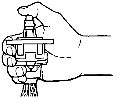 5. With the idle air control motor as shown in the illustration, connect the negative (-) terminal of the power supply to each clip as described in the following steps, and check whether or not a vibrating feeling (a feeling of very slight vibration of the stepper motor) is generated as a result of the activation of the stepper motor.