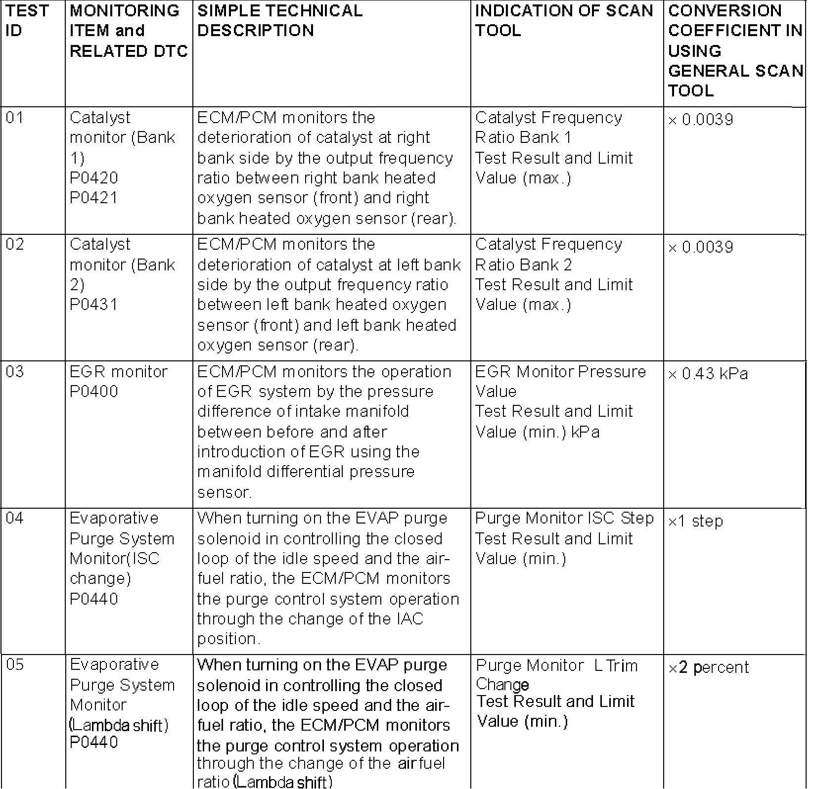 NOTE: When the monitored test results are erased by the battery disconnection and so on, the ECM/PCM outputs the values in hexadecimal of "00" or "FF", otherwise it outputs abnormal values and so on. In case of this, the ECM/PCM outputs are handled as invalid-values. When the first monitor (Readniess Status) is completed after this, the ECM/PCM outputs the valid-values.