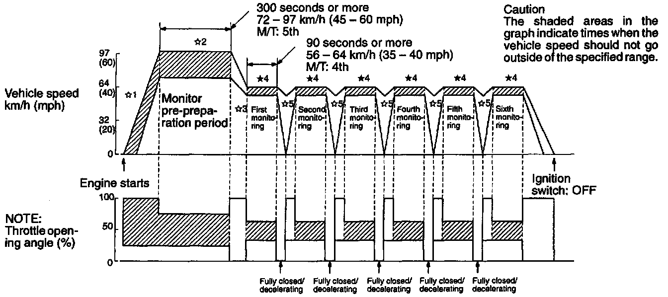 *4: Monitoring period: drive for 90 seconds or more on a level surface while maintaining the throttle opening angle at a constant angle (keeping throttle variations as small as absolutely possible) and the vehicle speed at between 56 - 64 km/h (35 - 40 mph).