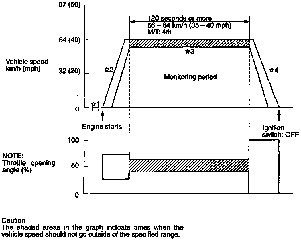 *3: Monitoring period: drive for 120 seconds or more while maintaining the throttle opening angle at a constant angle (keeping throttle variations as small as absolutely possible) and the vehicle speed at between 56 - 64 km/h (35 - 40 mph). Drive as consistently as possible during this time, without making any sudden steering wheel movements.