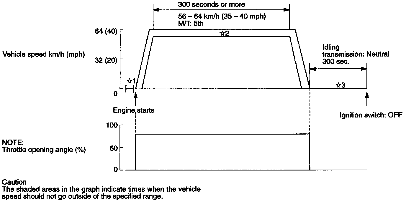 *2: Start the engine, accelerate to between 56 - 64 km/h (35 - 40 mph) and drive at this speed for 300 seconds or more. Then stop the vehicle. Braking and throttle operations can be carried out during this time.