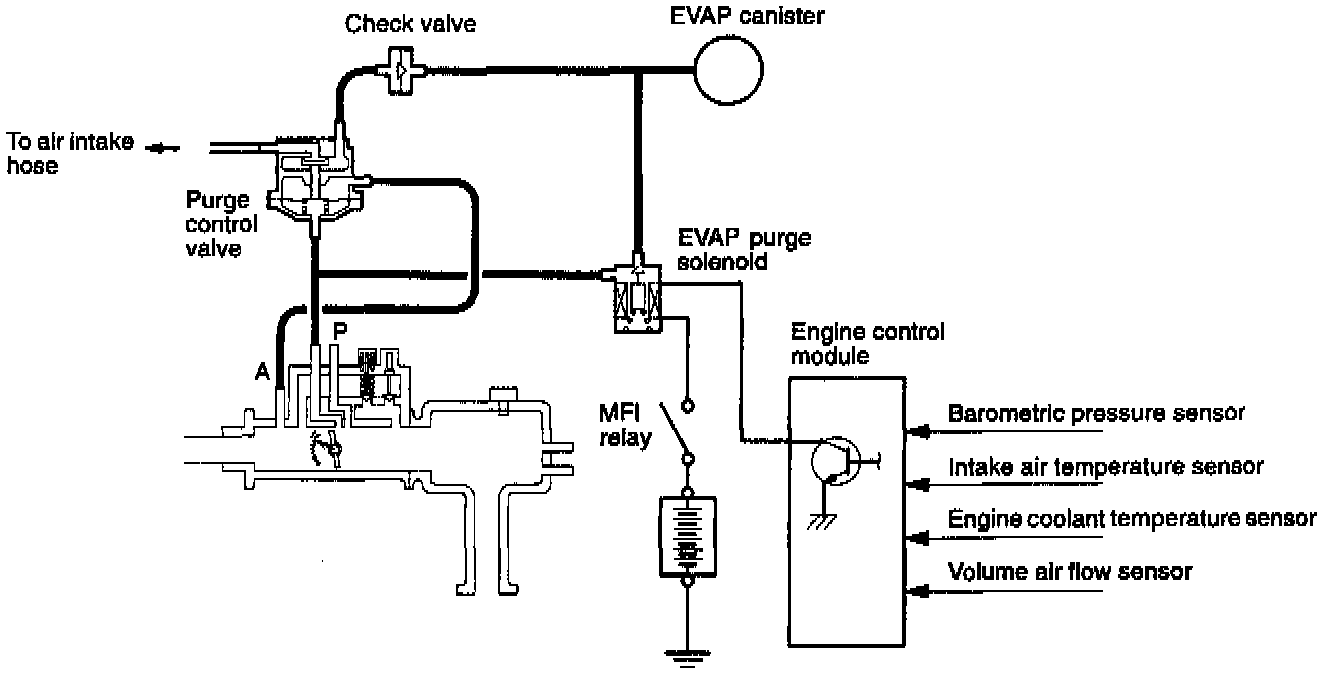 When driving with a low to medium load on the engine, the fuel vapor absorbed by the EVAP canister is drawn into the P port of the throttle body. When driving with a high load on the engine, the purge control valve opens and the fuel vapor absorbed by the EVAP canister is drawn into the air intake hose.