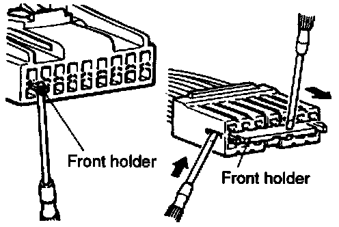 1. Insert screwdriver [1.4 mm (0.06 in.) width] as shown in the figure disengage front holder and remove it.
