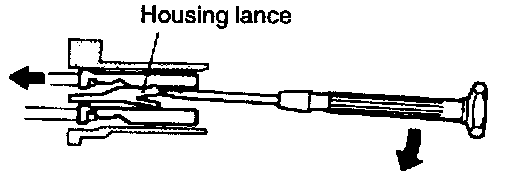 3. Insert tip of screwdriver [1.4 mm (0.06 in.) width] into connector in a manner as shown in the figure. Raise housing lance slightly with it and pull out harness.