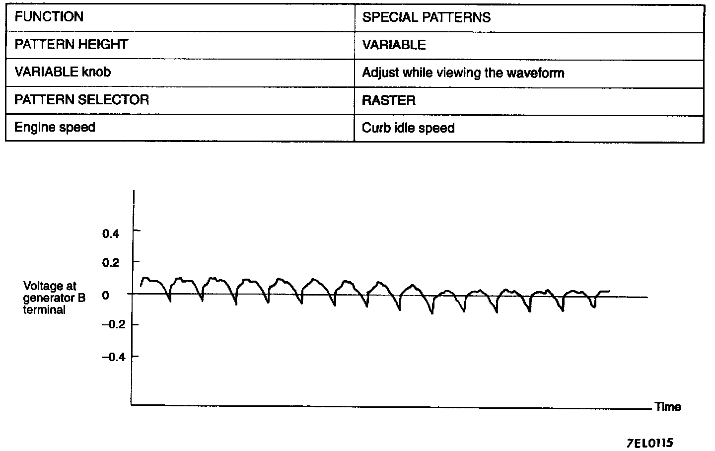 NOTE: Furthermore, the voltage waveform of the generator B terminal can undulate as shown at left. This waveform is produced when the regulator operates according to fluctuations in the generator load (current), and is normal for the generator.