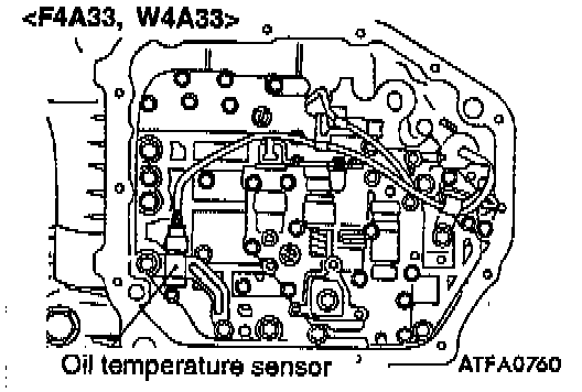 12. Temporarily install the valve body while inserting the detent plate pin in the manual valve groove. Then install the oil temperature sensor and holder and tighten the bolts with the specified torque.