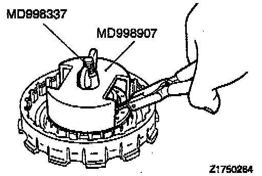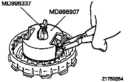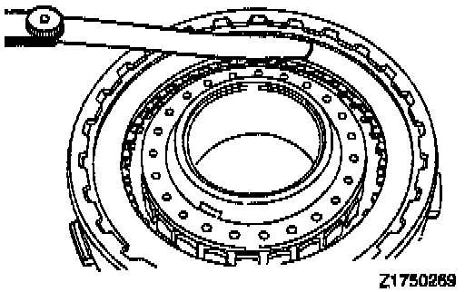 1. Check clearance between the snap ring and clutch reaction plate. To check the clearance, hold entire circumference of the clutch reaction plate down with 50 N (11 lbs.) force. If clearance is out of standard value, select a snap ring to obtain the standard value.