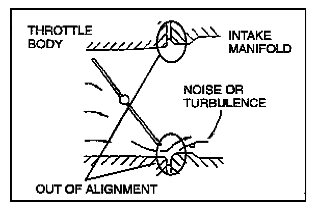Customers may report a surge or hesitation when driving at sustained speeds above 55 mph. Diagnosis may point to a malfunctioning air flow sensor (AFS), however, the problem may still occur after installing a new AFS. This symptom may be caused by misalignment of the throttle body on the intake manifold. A gap caused by this misalignment can create supersonic noise (or turbulence) which causes the AFS to operate improperly.