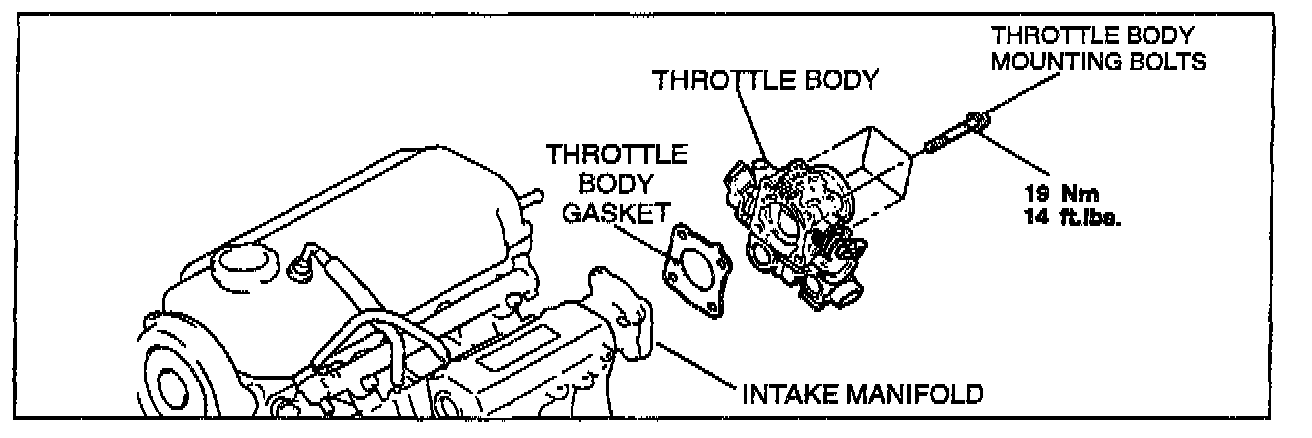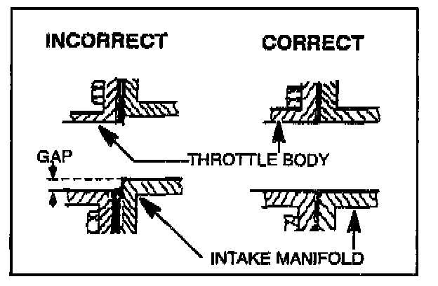 6. For proper throttle body to intake manifold alignment, lift and move the throttle body into the proper position to eliminate the incorrect gap shown in the illustration. While holding the throttle body in the aligned position, tighten the throttle body bolts to l9 Nm (14 ft-lbs).