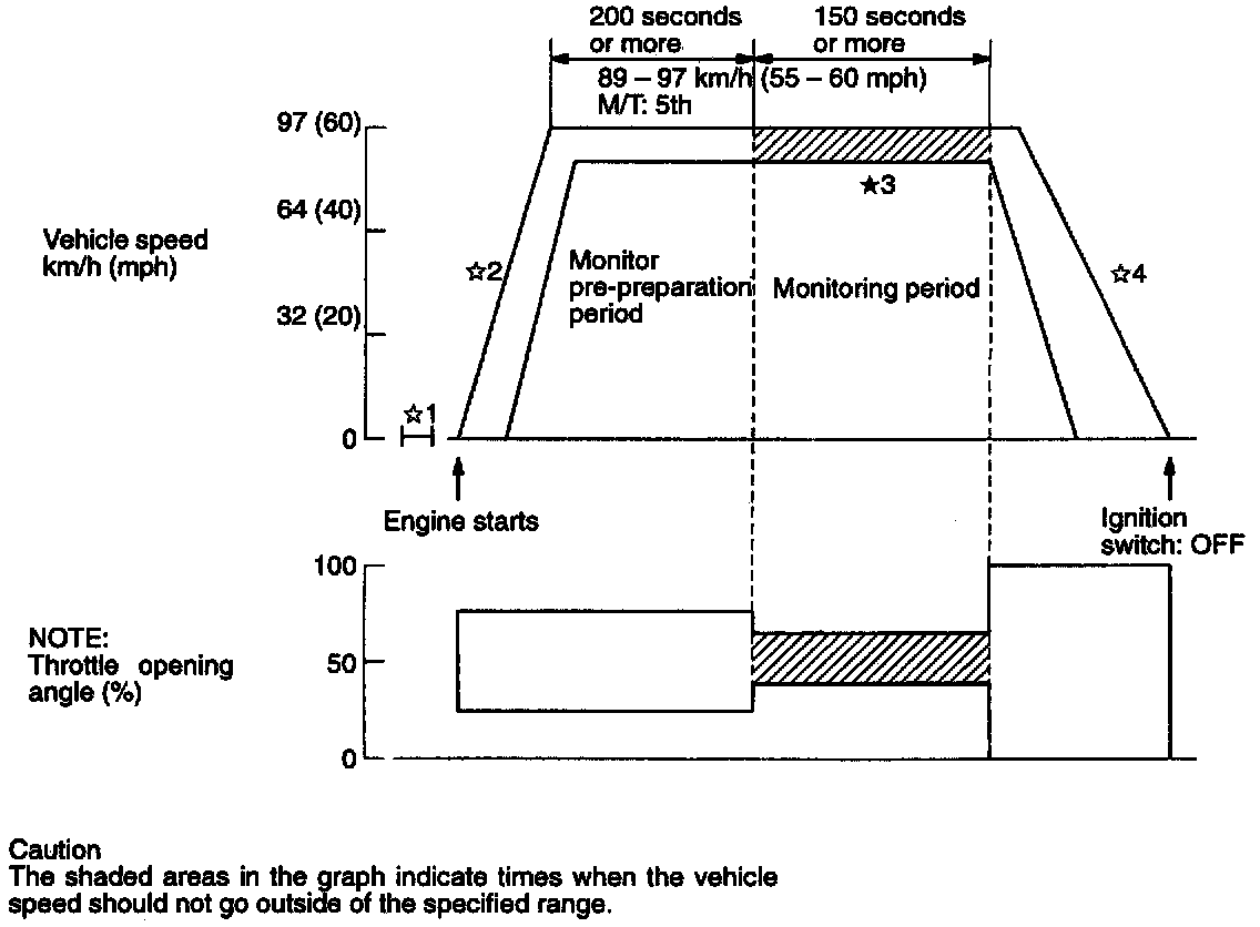 *3: Monitoring period: drive for 150 seconds or more while maintaining the throttle opening angle at a constant angle (keeping throttle variations as small as absolutely possible) and the vehicle speed at between 89 - 97 km/h (55 - 60 mph). Drive as consistently as possible during this time, without making any sudden steering wheel movements.