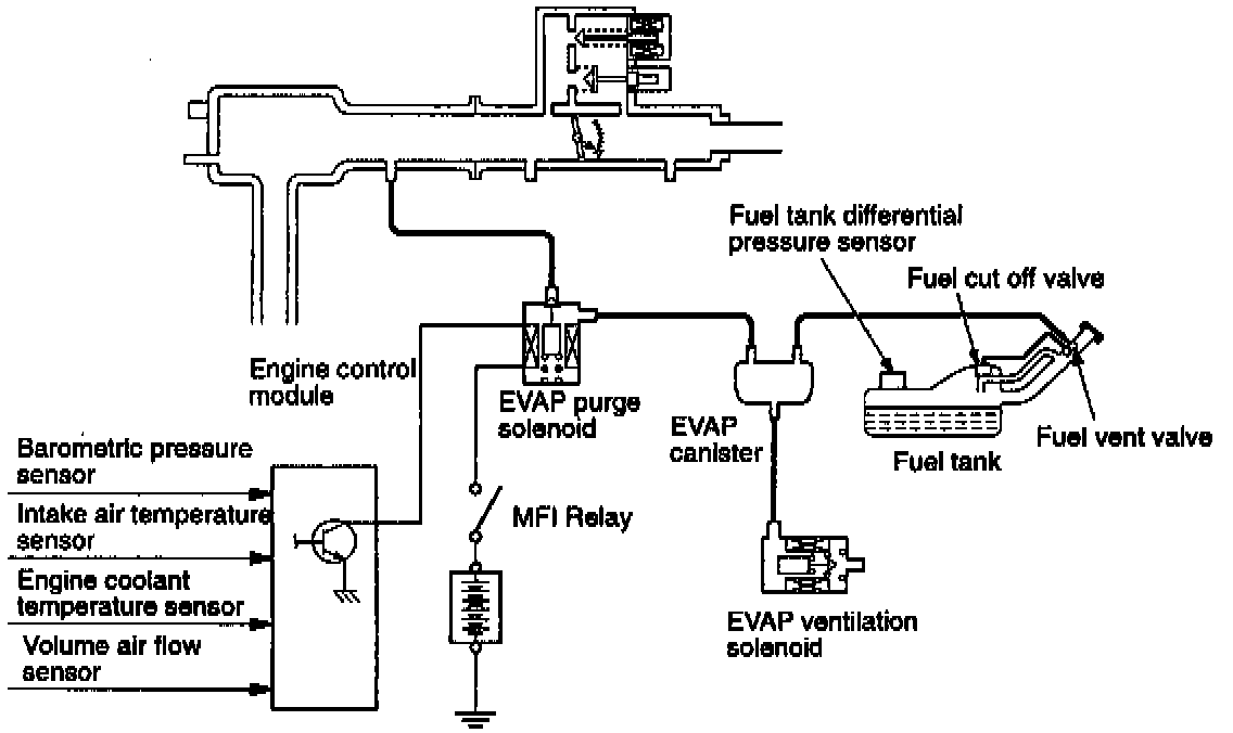 When the engine coolant temperature is low or when the intake air quantity is small (when the engine is at idle, for example), the engine control module brings the EVAP purge solenoid into the OFF state to shut off the fuel vapor flow to the intake manifold plenum. This does not only insure the driveability when the engine is cold or running under low load but also stabilize the emission level. Furthermore, an EVAP ventilation solenoid is locate between the EVAP canister and the atmosphere in order to carry out OBD-II EVAP leak monitoring. This solenoid is normally off, but turns on during OBD-II EVAP leak monitoring to shut off the flow of air into the EVAP canister from the atmosphere. Also, fuel vent valve is provided at fuel filler tube to prevent fuel from being over-filling to a fuel tank.