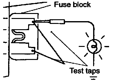 A blade type fuse has test taps provided to allow checking of the fuse itself without removing it from the fuse block. The fuse is okay if the test light comes on when its one lead is connected to the test taps (one at a time) and the other lead is grounded. (Change the ignition switch position adequately so that the fuse circuit becomes live.)