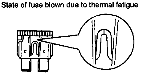 The illustration shows the state of a fuse blown due to this cause. In this case, do not replace the fuse with a new one hastily since a current heavy enough to blow the fuse has flowed through it. First, check the circuit for shorting and check for abnormal electric parts. Only after the correction of such shorting or parts, fuse of the same capacity should be used as a replacement. Never use a fuse of lager capacity than the one that has blown. If such a fuse is used, electric parts or wirings could be damaged before the fuse blows in the event an overcurrent occurs again.