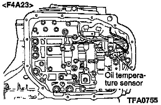 12. Temporarily install the valve body while inserting the detent plate pin in the manual valve groove. Then install the oil temperature sensor and holder and tighten the bolts with the specified torque.