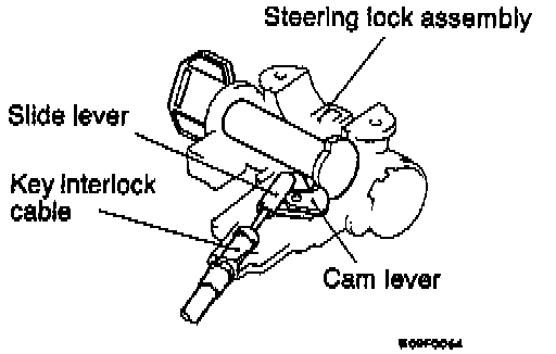 2. Install the slide lever, key interlock cable, and cam lever to the steering lock assembly as shown.