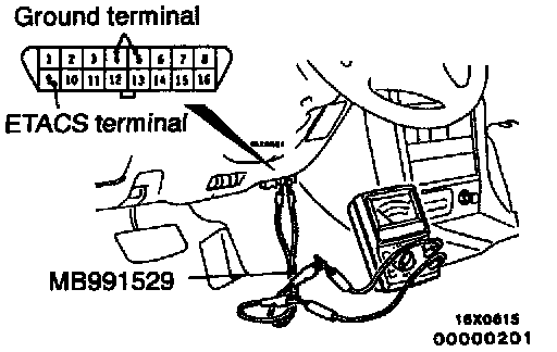 1. Use the special tool to connect a voltmeter between the ground terminal and the ETACS terminal of data link connector.