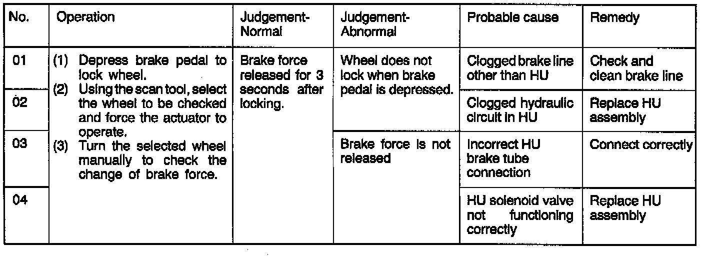 6. Turn the wheel by hand and check the change in braking force when the brake pedal is depressed. Use a braking force tester to check the braking force. When the actuator is force-driven with the brake pedal depressed the braking force must change. The correct results are shown.
