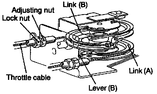 1. Tighten the adjusting nut in the direction to lessen the inner cable play of the throttle cable. At the position where the intermediate link B lever touches the intermediate link A unscrew the adjusting nut the specified number of turns.