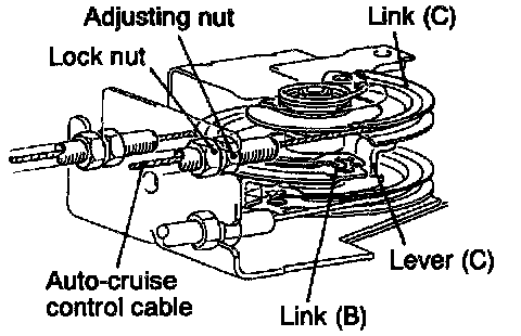 1. Tighten the adjusting nut in the direction to lessen the inner cable play of the auto-cruise control cable. At the position where the intermediate link C lever touches the intermediate link B, unscrew the adenosine nut the specified number of turns.