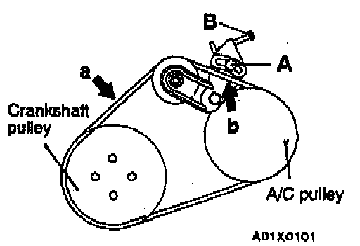1. Pull or push at the point (a) or (b) with a force of 98 N (22 lbs.) to measure drive belt deflection. The standard value is approximately 8.0 mm (0.32 inch)