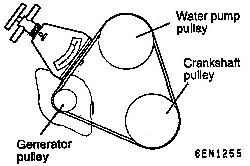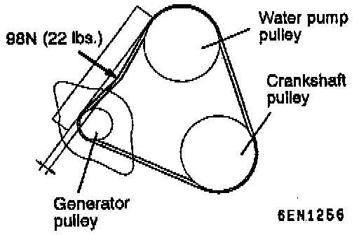 1. Pull or push at the mid point of the belt with a force of 98 N (22 lbs.) to measure drive belt deflection. The standard value is 5.5 - 8.0 mm (0.22 - 0.32 inch).