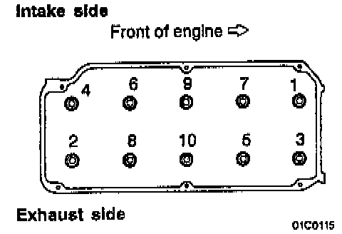 In the order shown, loosen the cylinder head bolts in 2 or 3 passes.