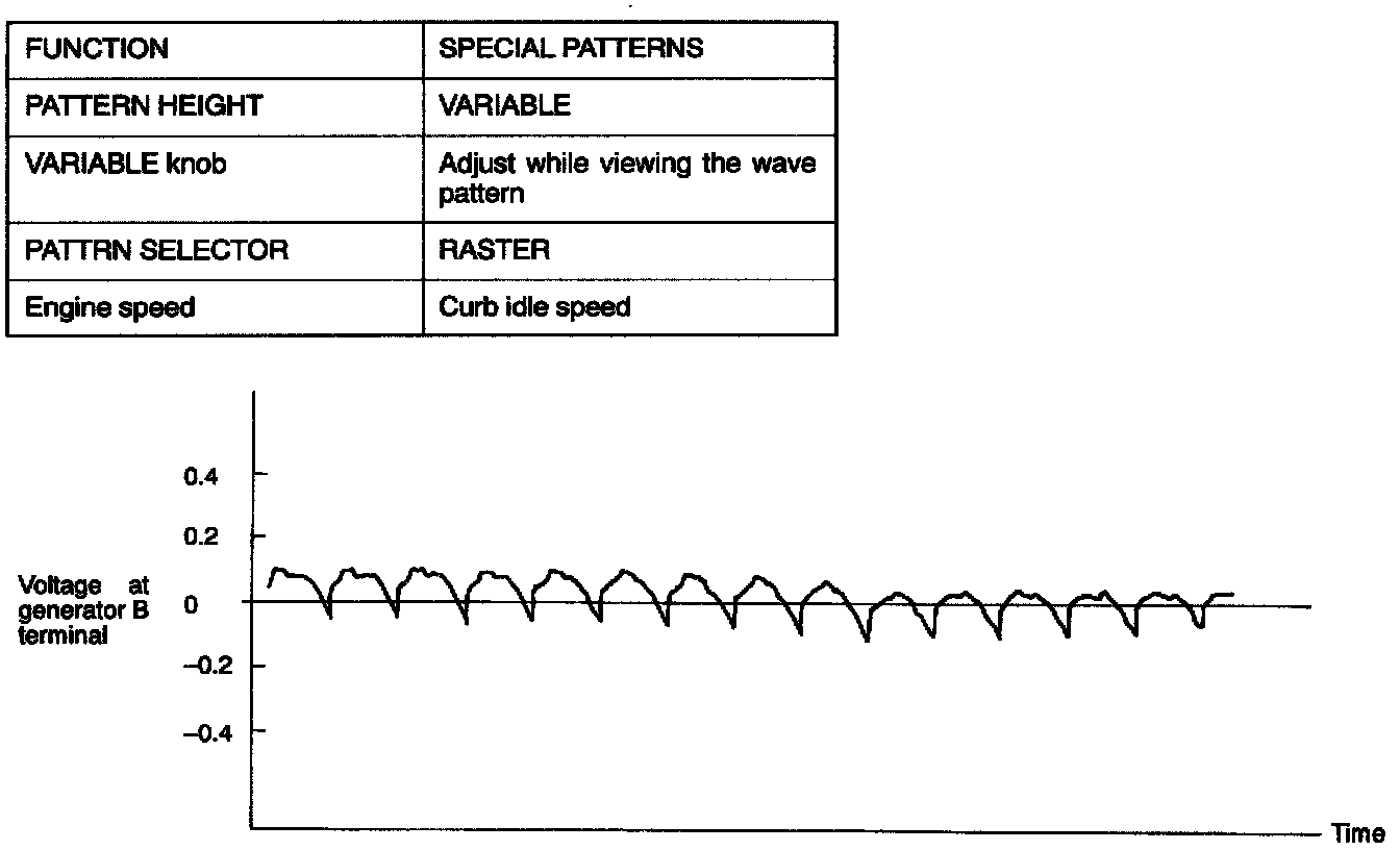 NOTE: Furthermore, the voltage waveform of the generator B terminal can undulate as shown at left. This waveform is produced when the regulator operates according to fluctuations in the generator load (current), and is normal for the generator.