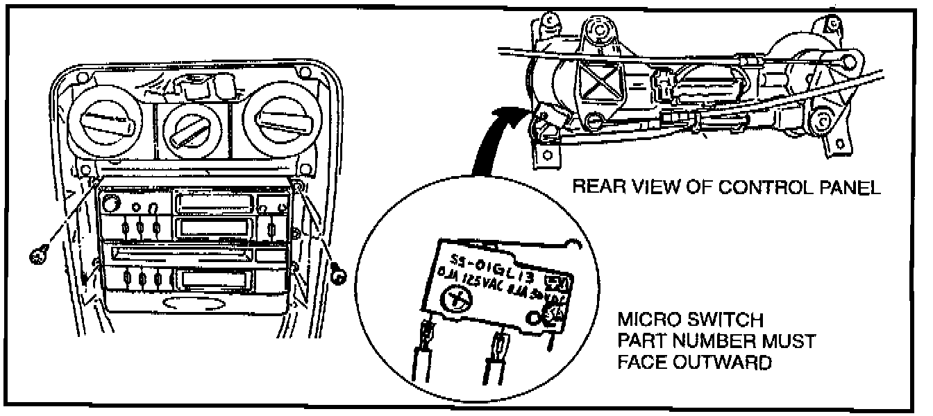 The air conditioner system micro switch can be installed backwards. When installing the MCC air conditioner kit into a 1997 Galant, refer to the illustration for mounting the micro switch. Make sure to install the switch onto the back of the control panel with the part number side facing outward, as shown.