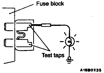 A blade type fuse has test taps provided to allow checking of the fuse itself without removing it from the fuse block. The fuse is okay if the test light comes on when its one lead is connected to the test taps (one at a time) and the other lead is grounded. (Change the ignition switch position adequately so that the fuse circuit becomes live.)