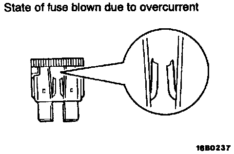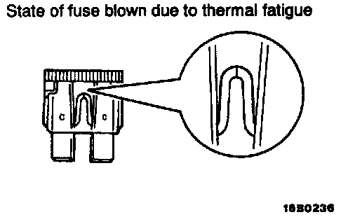 The illustration shows the state of a fuse blown due to this cause. In this case, do not replace the fuse with a new one hastily since a current heavy enough to blow the fuse has flowed through it. First, check the circuit for shorting and check for abnormal electric parts. Only after the correction of such shorting or parts, fuse of the same capacity should be used as a replacement. Never use a fuse of larger capacity than the one that has blown. If such a fuse is used, electric parts or wirings could be damaged before the fuse blows in the event an overcurrent occurs again.